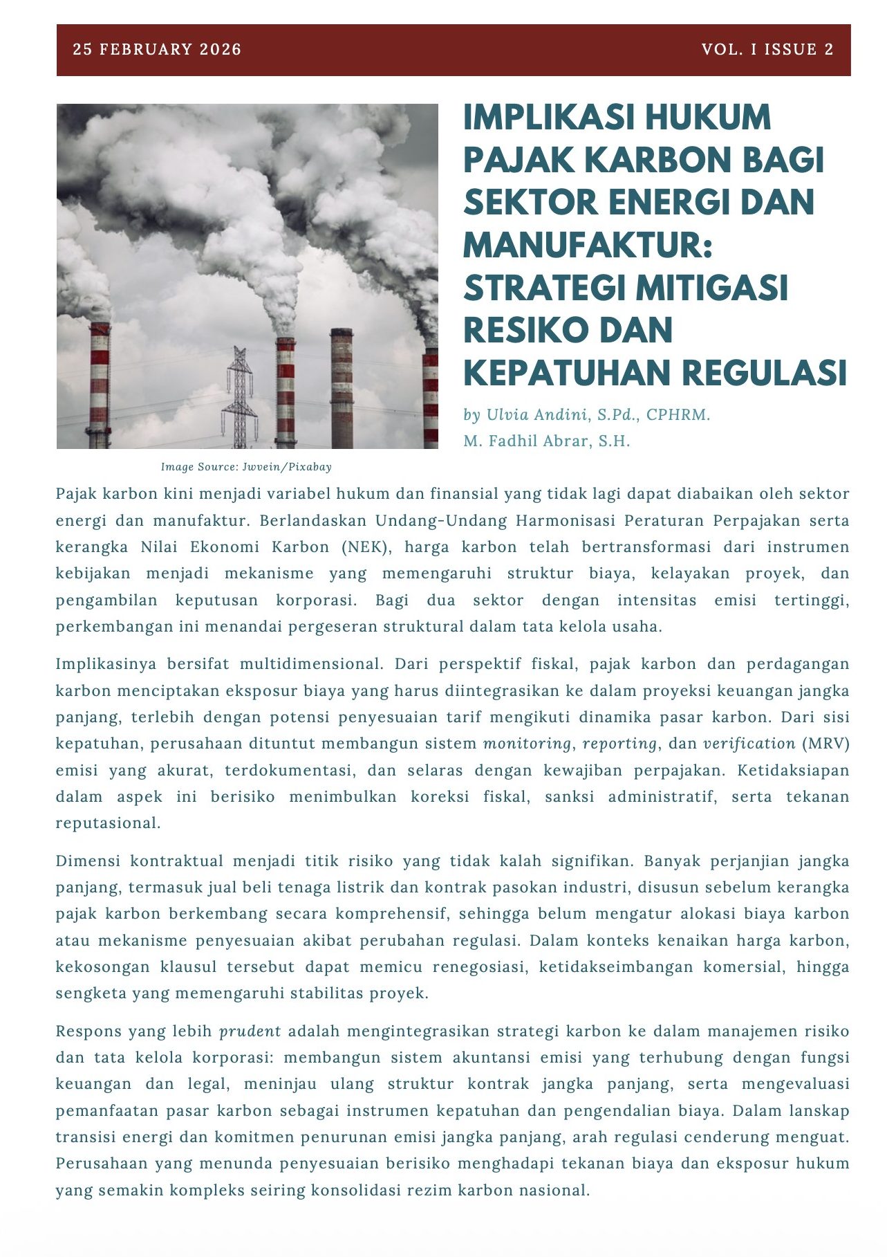 IMPLIKASI HUKUM PAJAK KARBON BAGI SEKTOR ENERGI DAN MANUFAKTUR: STRATEGI MITIGASI RESIKO DAN KEPATUHAN REGULASI